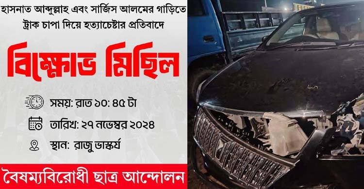 বৈষম্যবিরোধী ছাত্র আন্দোলনের আহ্বায়ক হাসনাত আব্দুল্লাহ ও কেন্দ্রীয় সমন্বয়ক সারজিস আলমকে ‘ট্রাকচাপা দিয়ে হত্যাচেষ্টা’র প্রতিবাদে ঢাকা বিশ্ববিদ্যালয়ে বিক্ষোভ মিছিলের ডাক দিয়েছে সংগঠনটি।