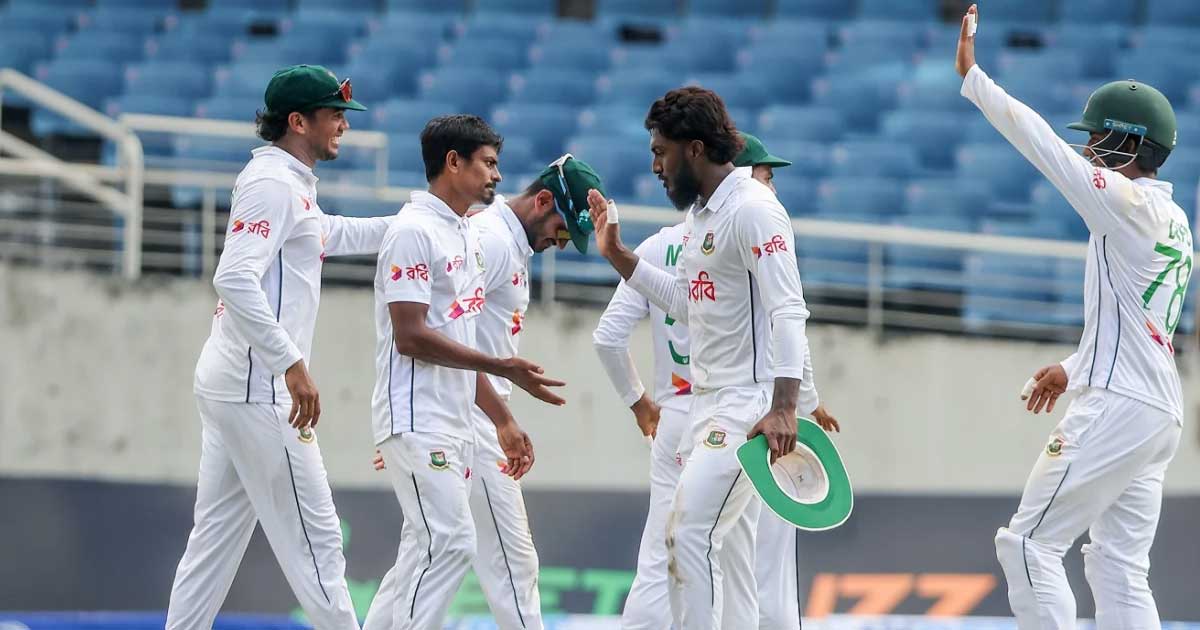 বাংলাদেশ (দ্বিতীয় ইনিংস)- ২৬৮/১০ (৫৯.৫ ওভার) (জয় ০, সাদমান ৪৬, দিপু ২৮, মিরাজ ৪২, লিটন ২৫, জাকের ৯১, আলজারি ৩/৭৭, রোচ ৩/৩৬)