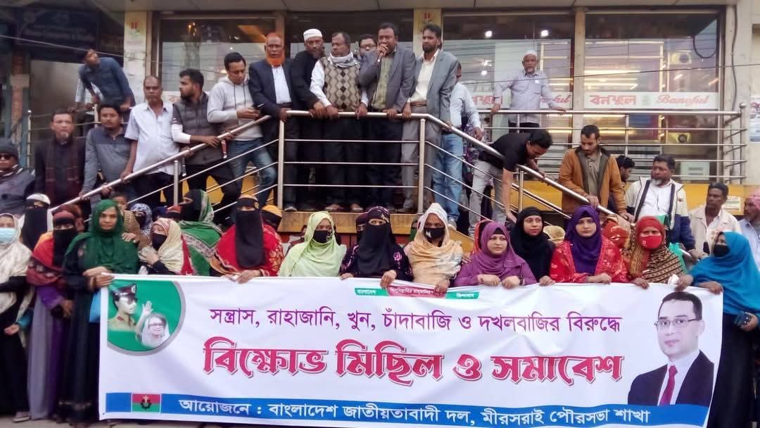 সন্ত্রাস, খুন, চাঁদাবাজী, দখলবাজীর বিরুদ্ধে বিক্ষোভ মিছিল ও সমাবেশ করেছে মিরসরাই পৌরসভা বিএনপি।
