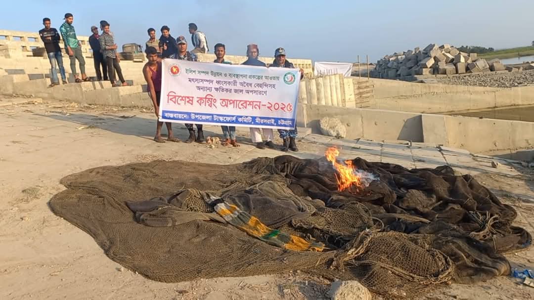 মিরসরাইয়ে মৎস্য সম্পদ বিনষ্টকারী ১ টি বেহুন্দি ও ২ টি মশারি জাল জব্দ করে পুড়িয়ে ধ্বংস করা হয়েছে।