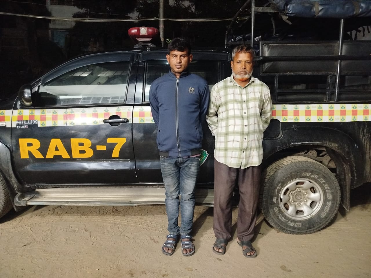 উক্ত তথ্যের ভিত্তিতে বৃহস্পতিবার দিবাগত রাতে র্যাব-৭, চট্টগ্রামের একটি আভিযানিক দল ফেনী সদর মডেল থানার মধ্যম রামপুর এলাকায় ঢাকা-চট্টগ্রাম মহাসড়কের উপর একটি অস্থায়ী চেকপোস্টের স্থাপন করে বিসমিল্লাহ পরিবহন নামীয় একটি যাত্রীবাহী বাসকে থামানোর সংকেত দিলে গাড়ীটি চেকপোস্টের সামনে থামালে গাড়ী হতে দু’জন ব্যক্তি কৌশলে পালিয়ে যাওয়ার সময় দু’জনকে আটক করে।