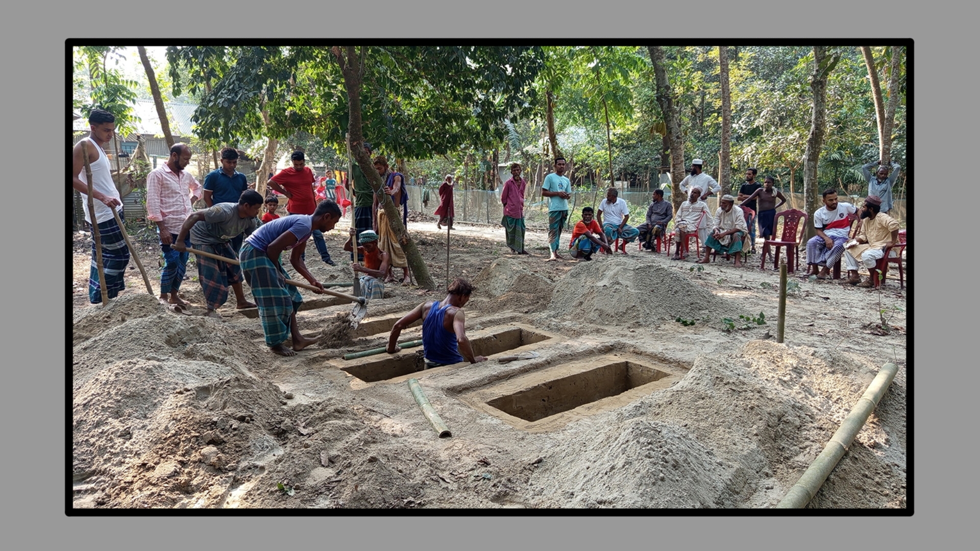 এ সময় বাড়ির আঙিনায় একসঙ্গে পাশাপাশি চারটি কবর খুড়ছেন বেশ কতক লোক। উঠানে পাশাপাশি রাখা হয়েছে মরদেহ রাখার চারটি খাটিয়া। আর বাড়ির ভেতরে ঘরে বসে স্বজন হারানোর বেদনায় বিলাপ করছেন নারীরা। এতে ভারি হয়ে উঠেছে বাড়িটির পরিবেশ।