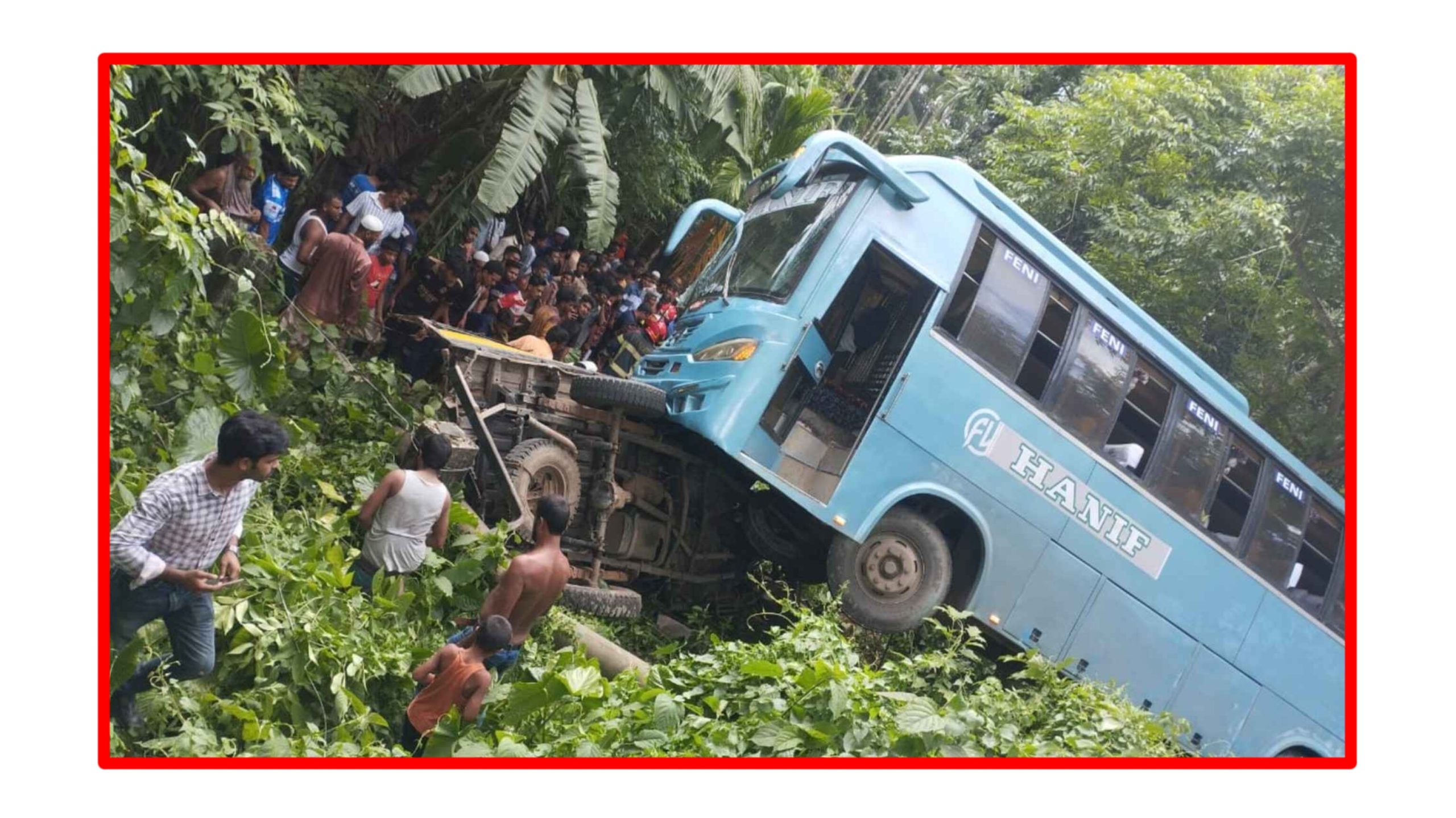 এ সময় বিপরীত দিক থেকে দ্রুতগামী হানিফ পরিবহনের একটি বাস এসে পিকআপটিকে ধাক্কা দেয়। সংঘর্ষে ঘটনাস্থলেই দু’জন নিহত হন। দুর্ঘটনার পর সড়কে যান চলাচল কিছু সময়ের জন্য বন্ধ হয়ে যায়।