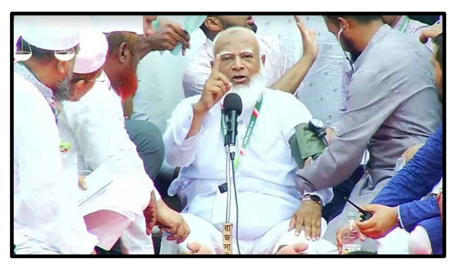 এরপর দুর্নীতিমুক্ত বাংলাদেশ গড়ার আহ্বান জানিয়ে তিনি কথা বলতে শুরু করে আবারও অসুস্থ হয়ে পড়েন। জামায়াতের স্বেচ্ছাসেবক ও চিকিৎসকরা তাকে প্রাথমিক চিকিৎসা দেওয়ার চেষ্টা করলে বাধা দেন তিনি।