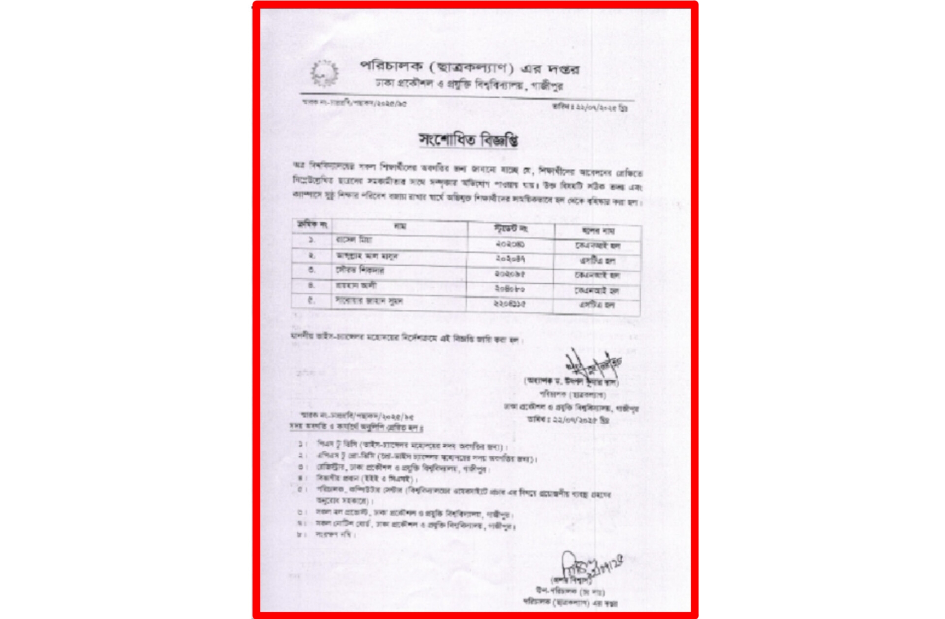 গত সোমবার (২২ জুলাই) ডুয়েটের পরিচালক (ছাত্রকল্যাণ) অধ্যাপক ড. উৎপল কুমার দাস স্বাক্ষরিত এক বিজ্ঞপ্তিতে বলা হয়েছে, বিশ্ববিদ্যালয়ের শিক্ষার্থীদের অবগতির জন্য জানানো যাচ্ছে যে তাদের আবেদনের প্রেক্ষিতে সমকামিতার অভিযোগের সঠিক তদন্ত এবং ক্যাম্পাসে সুষ্ঠু শিক্ষার পরিবেশ বজায় রাখার স্বার্থে অভিযুক্ত শিক্ষার্থীদের সাময়িকভাবে হল থেকে বহিষ্কার করা হলো।