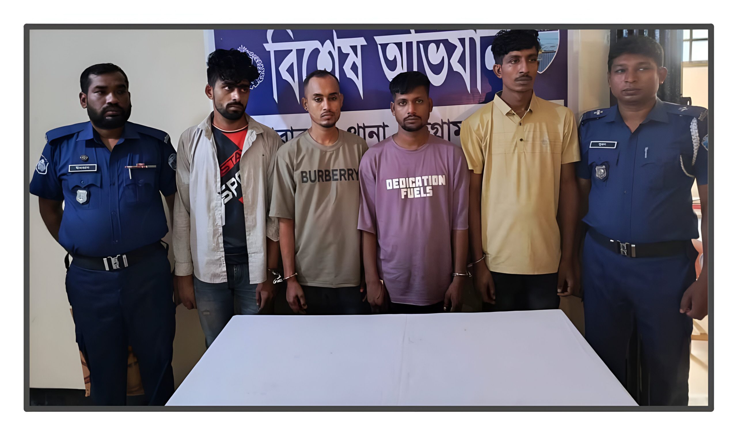গ্রেফতার ব্যক্তিরা হলেন: উপজেলার জোরারগঞ্জ ইউনিয়নের খিলমুরারী গ্রামের শাহ আলমের ছেলে শীর্ষ সন্ত্রাসী হক সাব (২৭), একই গ্রামের মুক্তার হুজুর বাড়ির আবুল হোসেনের ছেলে আবু সাইদ (২৭), হিঙ্গুলী ইউনিয়নের মেহেদীনগর গ্রামের আবুল কাশেমের ছেলে ইউসুফ প্রকাশ ডাক্তার (২৬) ও একই ইউনিয়নের কদমতলা এলাকার ওবাইদুল হকের ছেলে এমরান হোসেন (২৭)।