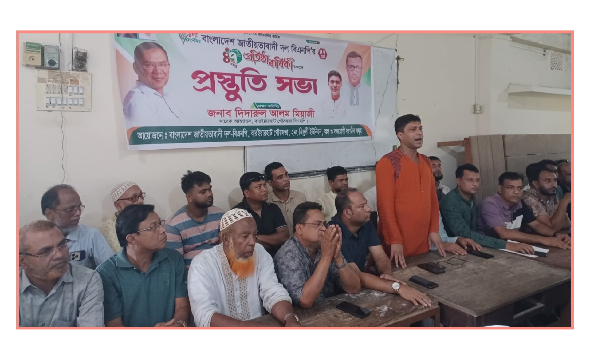 স্টাফ রিপোর্টার ; বাংলাদেশ জাতীয়তাবাদী দল বিএনপি’র ৪৭তম প্রতিষ্ঠাবার্ষিকী উদযাপন উপলক্ষে শনিবার সকালে বারইয়ারহাট ডিগ্রি কলেজ মিলনায়তনে বারইয়ারহাট পৌর বিএনপি ও হিঙ্গুলী ইউনিয়ন বিএনপি ও দলের সহযোগী অঙ্গ সংগঠনের আয়োজনে এক প্রস্তুতি সভা অনুষ্ঠিত হয়েছে।