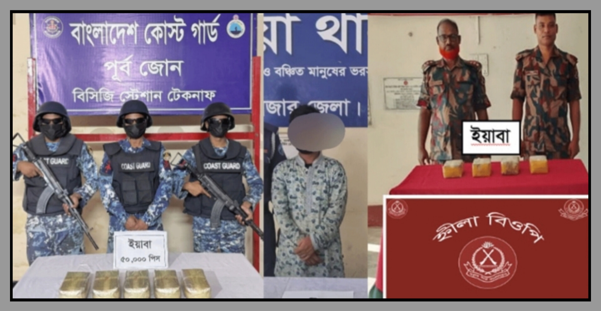 মঙ্গলবার (১৪ অক্টোবর) বাংলাদেশ কোস্ট গার্ডের মিডিয়া কর্মকর্তা লেফটেন্যান্ট কমান্ডার সিয়াম-উল-হক জানান, গত সোমবার (১৩ অক্টোবর) রাত ৯টার দিকে টেকনাফ থানার জালিয়াপাড়া নাফ নদীর তীরবর্তী এলাকায় অভিযান চালিয়ে এক ব্যক্তির ফেলে যাওয়া প্লাস্টিকের বস্তা থেকে ৫০ হাজার পিস ইয়াবা উদ্ধার করা হয়। এর আনুমানিক বাজারমূল্য প্রায় ২ কোটি ৫০ লাখ টাকা।