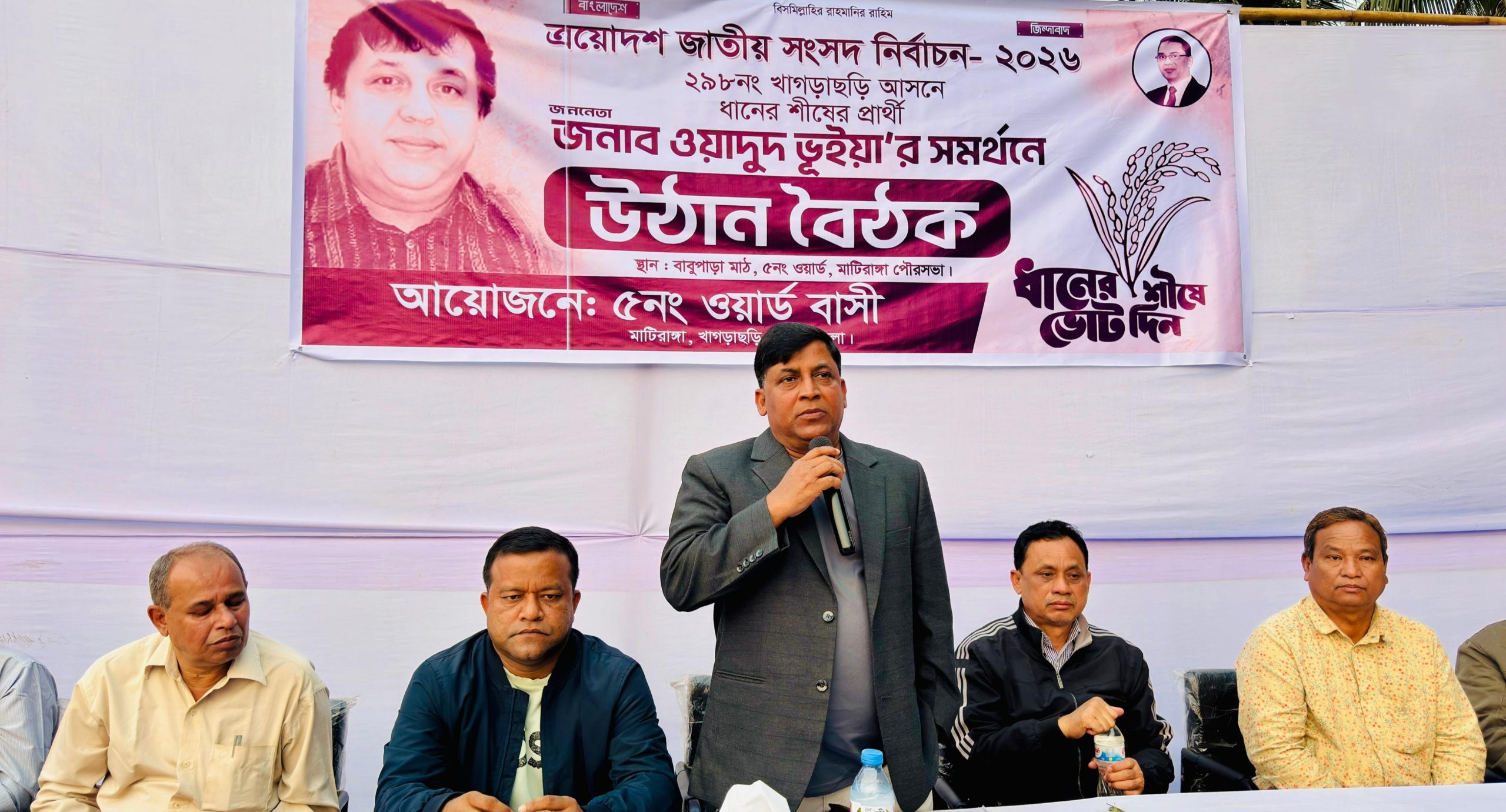ফারুক হোসেন, নিজস্ব প্রতিবেদক (খাগড়াছড়ি) : খাগড়াছড়ির মাটিরাঙ্গায় বাংলাদেশ জাতীয়তাবাদী দল (বিএনপি) মনোনীত প্রার্থী খাগড়াছড়ি জেলা বিএনপির সভাপতি ওয়াদুদ ভূইয়া’র পক্ষে জনসংযোগ ও উঠান বৈঠকে সরগরম হয়ে উঠেছে মাটিরাঙ্গা।
