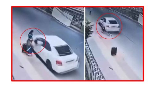শাড়ি পরা এক নারী ট্রলি ব্যাগ হাতে রাস্তায় দাঁড়িয়ে ছিলেন। হঠাৎ একটি প্রাইভেটকার আসে। চলন্ত প্রাইভেটকারের সামনের জানালা দিয়ে একজন ঝুঁকে পড়েন এবং সেই নারীর হাতে থাকা ভ্যানিটি ব্যাগ ছোঁ…