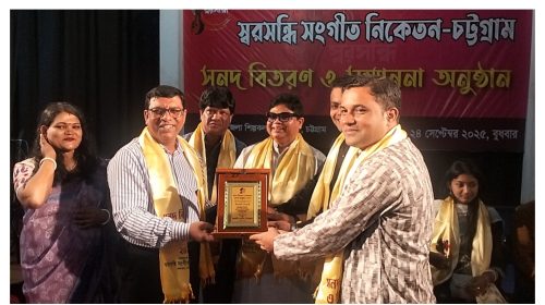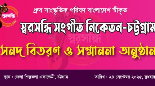 আগামীকাল ২৪শে সেপ্টেম্বর ২০২৫ রোজ বুধবার ধ্রুব সাংস্কৃতিক পরিষদ স্বীকৃত 'স্বরসন্ধি সংগীত নিকেতন' চট্টগ্রাম এর সনদ বিতরণ ও সম্মাননা প্রদান অনুষ্ঠানের আয়োজন করা হয়েছে। স্থান; জেলা শিল্পকলা একাডেমি, সময় ;…